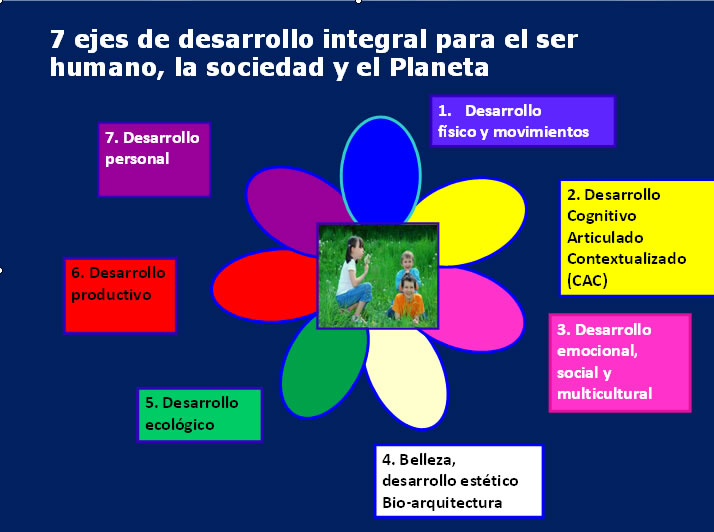 - Educación integral: desarrollo físico, emocional, cognitivo articulado, ecológico, ético/solidario, social, multicultural, intuitivo y de conciencia.