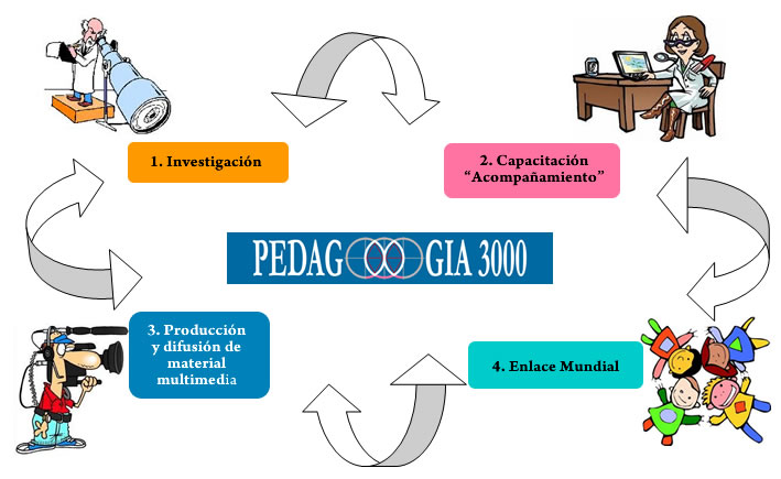 3. Producción y difusión del material multimedia 3.1. Producción y difusión del material multimedia: Idear, producir, compilar material multimedia de apoyo a la sociedad en temas de educación, pedagogía, de desarrollo personal y otras materias que permitan la construcción armónica de una nueva sociedad. 4. Enlace mundial 4.1. Enlace mundial para una nueva educación: Fomentar redes, enlaces y encuentros de ayuda e intercambios a nivel local, nacional e internacional en los mencionados temas. 4.2. Desarrollar de manera creativa toda línea de acción que apoye a nuestro compromiso. |